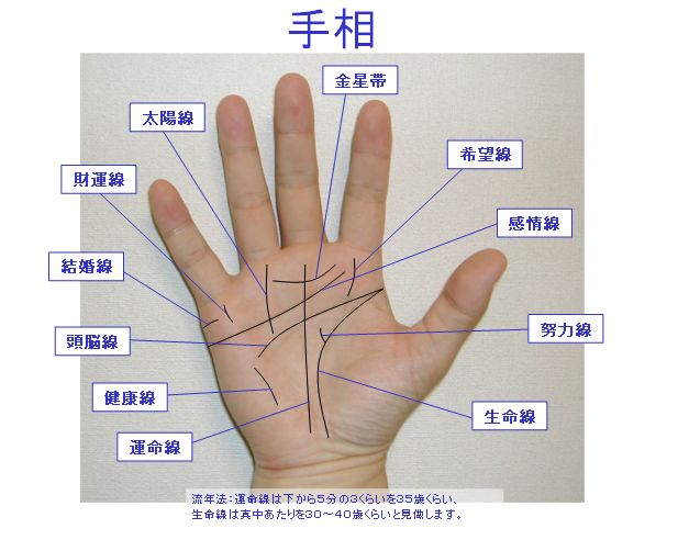 - 生命線: 生命線の変化や分岐が、その年齢における健康や運勢の変化を示すことがあります。例えば、生命線に新たな枝が出ると、新しい出来事や変化の兆しと見なされることがあります。